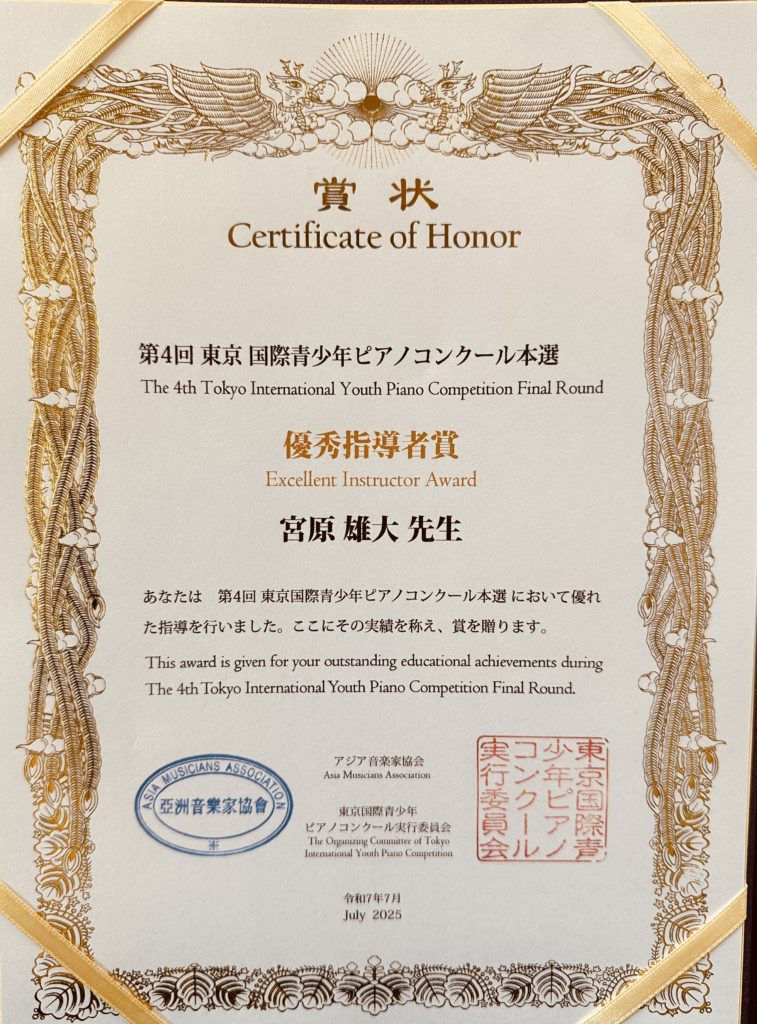 ☆第12回東京国際ピアノコンクール 本選 小学6年生の部本選 審査員賞